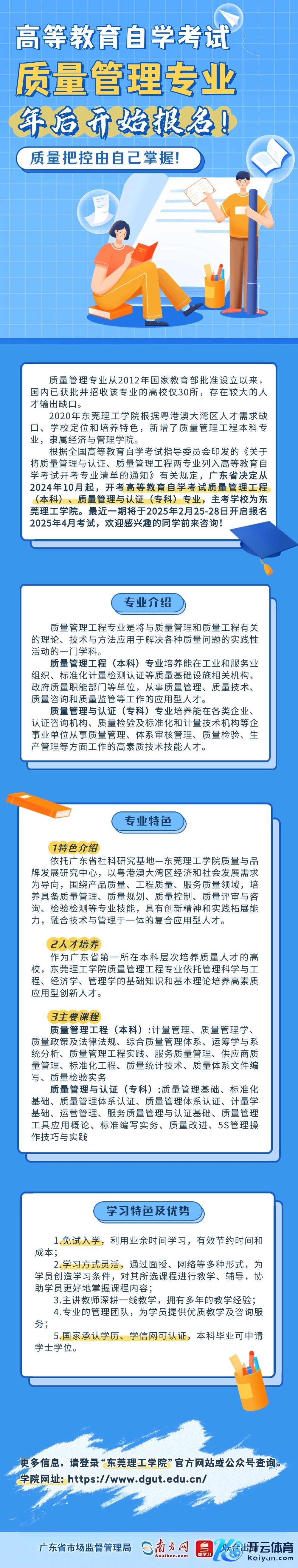 凭证寰宇高档教授自学考试指导委员会印发的《对于将质料管制与认证、质料管制工程两专科列入〈高档教授自学考试开考专科清单〉的见告》相关轨则,广东省决定从2024年10月起,开考高档教授自学考试质料管制工程(本科)、质料管制与认证(专科)专科,主考学校为东莞理工学院。