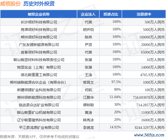 本站音讯,把柄天眼查APP泄露,威领股份(002667.SZ)新增扫数对外投资事件,被投资公司为长沙领好科技有限公司,法定代表东谈主代爽,投资占比为100%。该公司从事科技实行和行使工功课,注册成本为500万东谈主民币。现在,威领股份共存在对外投资15项,详见下表: