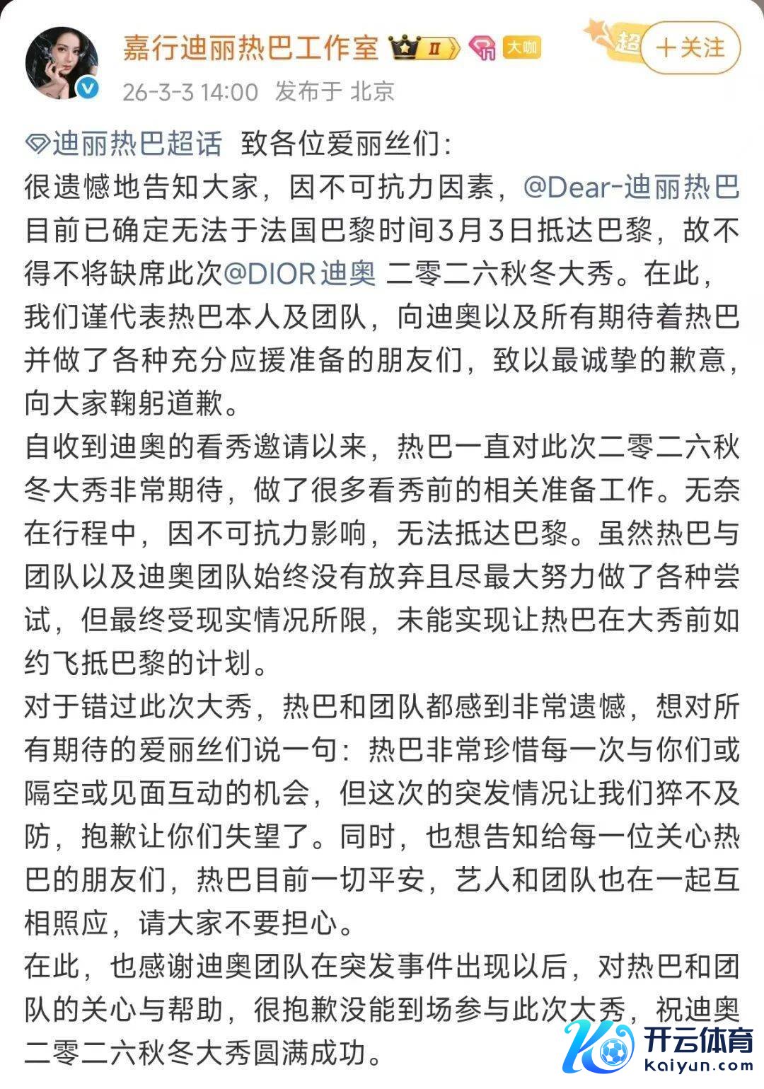 直至3月3号,笃定迪丽热巴无法在大秀开动前赶到才发表声明。