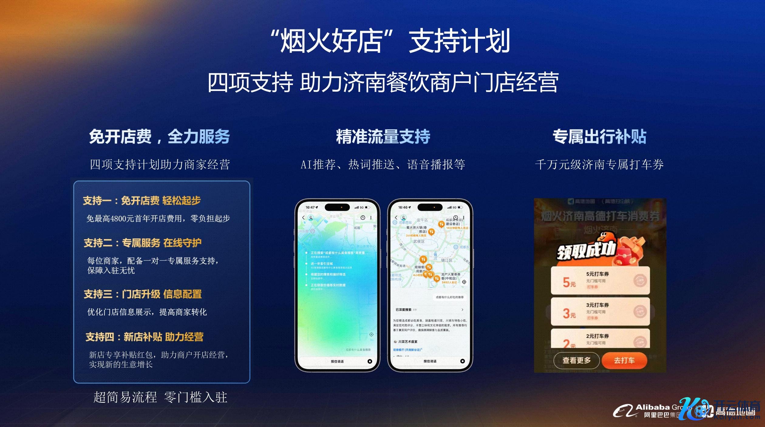 12月16日凯时体育游戏app平台,在高德扫街榜“烟火城市系列发布会·烟火济南”行为现场,济南市商务局、济南市工商联餐饮协会、济南市饭馆业协会、济南市餐饮与住宿行业协会联袂阿里巴巴旗下高德矜重启动 “烟火济南相沿规划”, 旨在切实裁减土产货商家策动本钱,激勉城市耗尽活力。 字据该规划,餐饮商家入驻高德可免最高4800元的首年开店费,并同步获取流量补贴、专属客服、智能收银等一系列相沿就业。此外,针对商家不同成长阶段,高德还提供分层成长助力体系:新店期依托流量扶捏+专项补贴,助力商户高效启动;成弥...